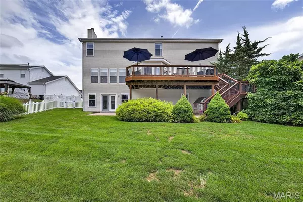 Welcome to this beautifully maintained 5 Bed, 4.5 bath 2-story home offering over 4,300 sq ft of living space and located in the sought-after Wentzville School District. From the moment you step inside, you'll notice the carpet in the dining and office, rich walnut-stained wood floors, and crown molding that add warmth and sophistication throughout the main level. The First floor boasts a formal dining room with elegant wainscoting, a private office with glass French doors, and a spacious living room featuring a cozy wood-burning fireplace and a wall of windows that fill the space with natural light. The gourmet kitchen is a chef's dream with custom white cabinetry, granite countertops, a stylish backsplash, stainless steel appliances, walk-in pantry, and a large breakfast island. Just off the kitchen, you'll find a convenient laundry room and a separate half bath. Upstairs offers a versatile bonus room and four generously sized bedrooms, including a luxurious primary suite with a fully remodeled en-suite bath and an expansive walk-in closet with built-in organizers. Jack&Jill bedrooms with shared bath and 4th bdrm has its own private bath! Finished walk-out lower level adds even more living space, featuring a fitness/rec room, fifth bedroom, and a full bathroom—perfect for guests or multi-generational living. Step outside to your private backyard oasis with a fenced yard, a deck and a sprawling stamped concrete patio ideal for entertaining.